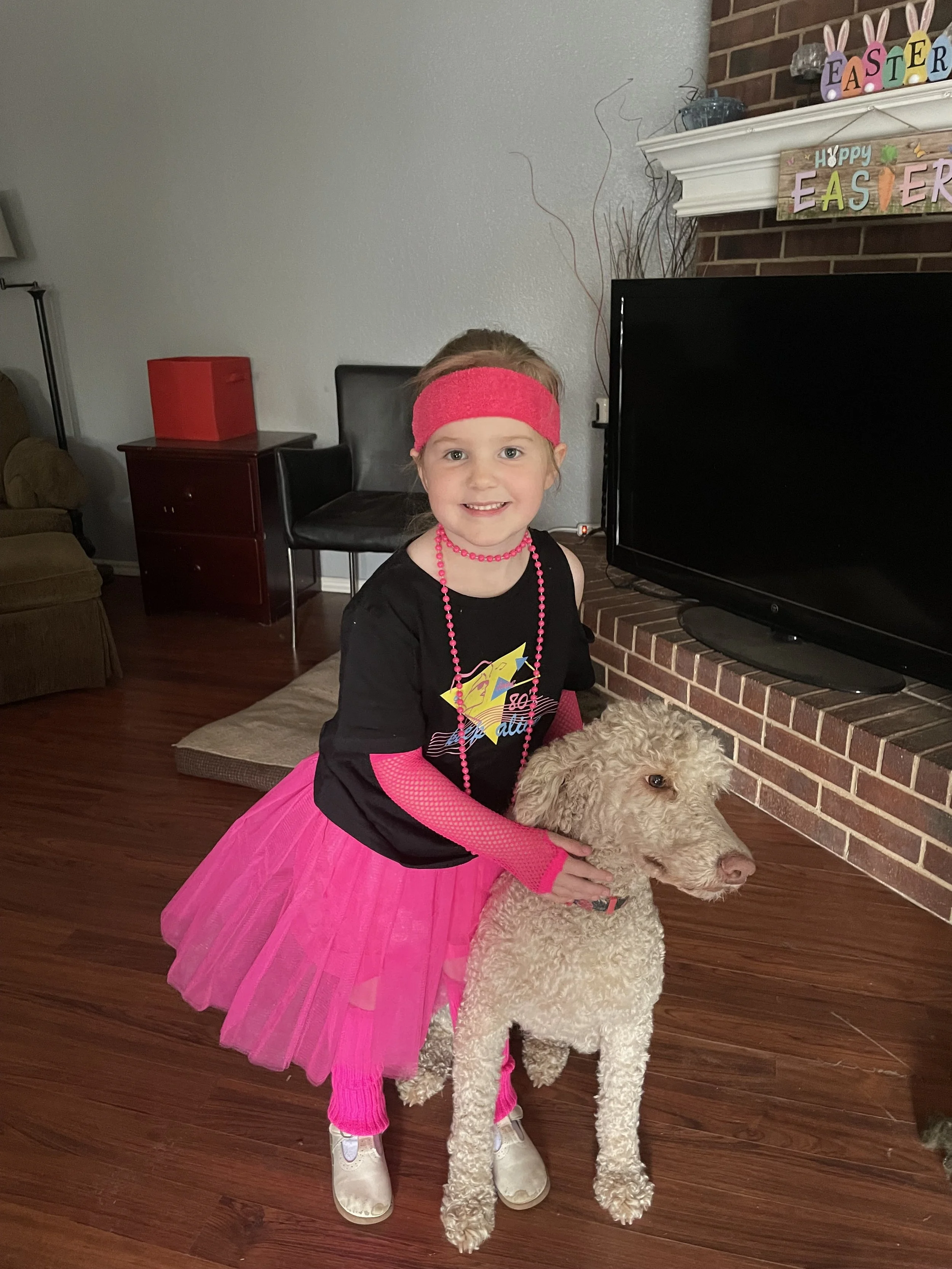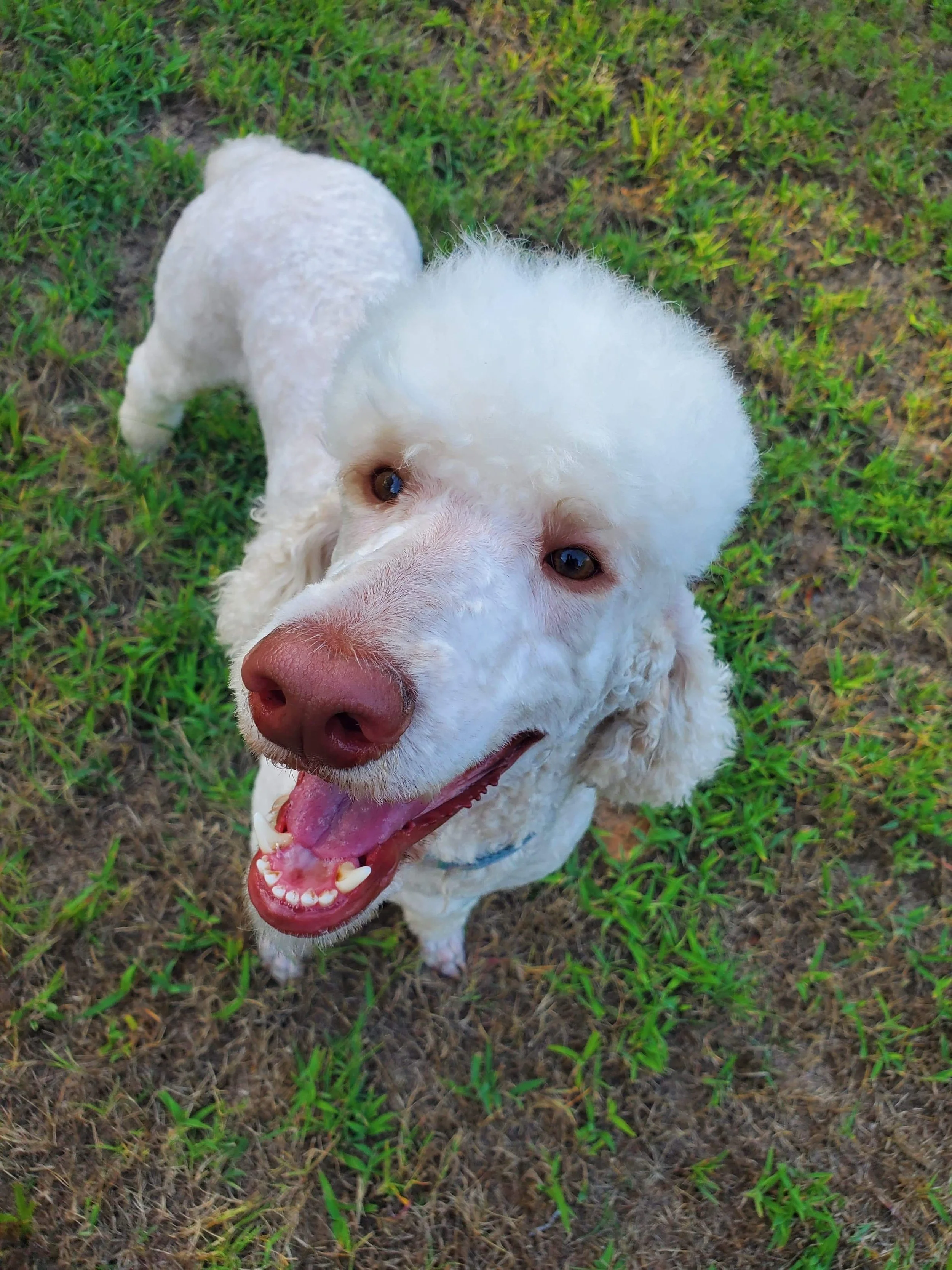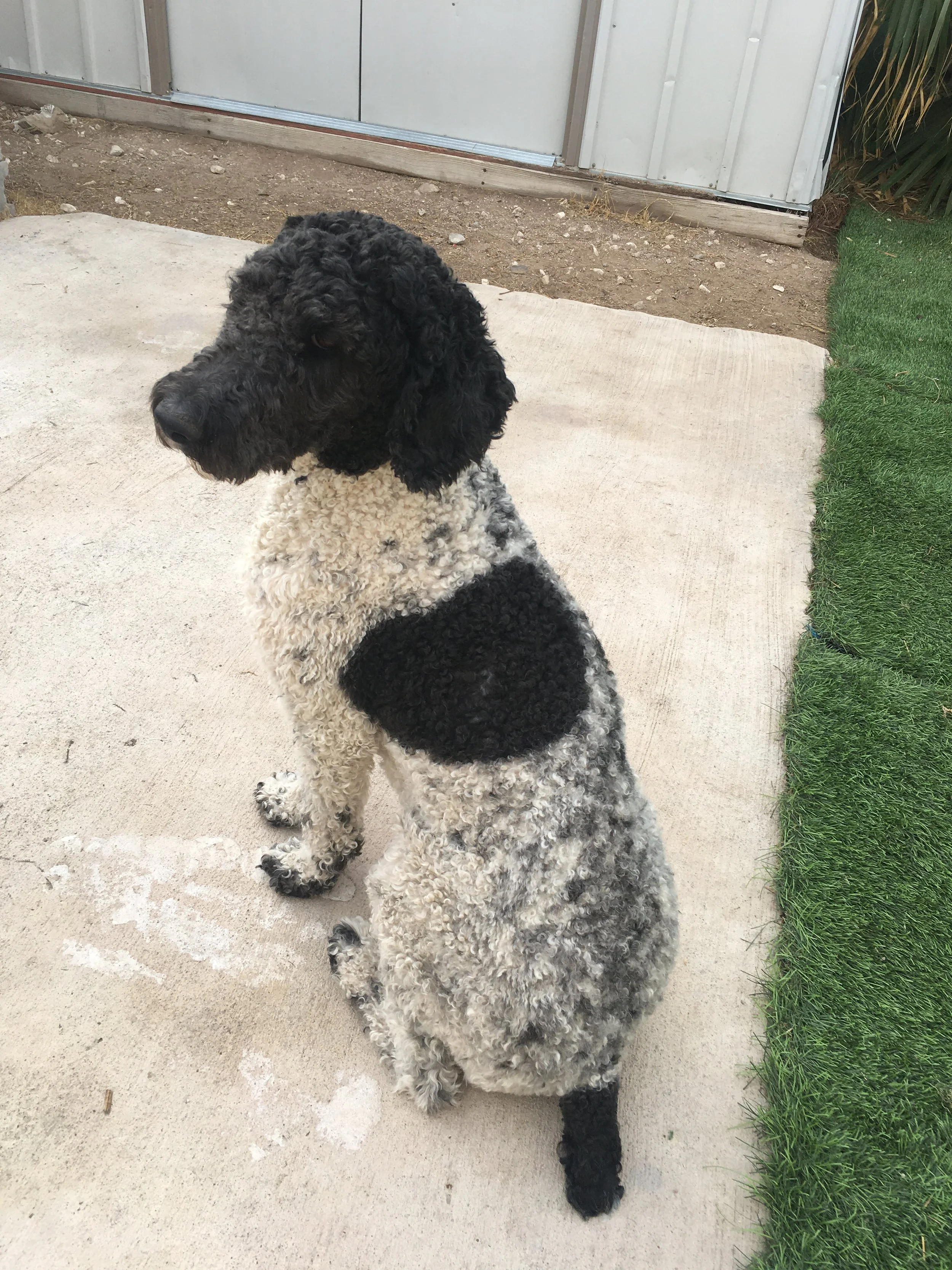 All of our females are AKC registered poodles: Aspen, Honey, and Dolly are Apricot partis and Applejack is a Black parti poodle. They all weigh around 40 lbs.